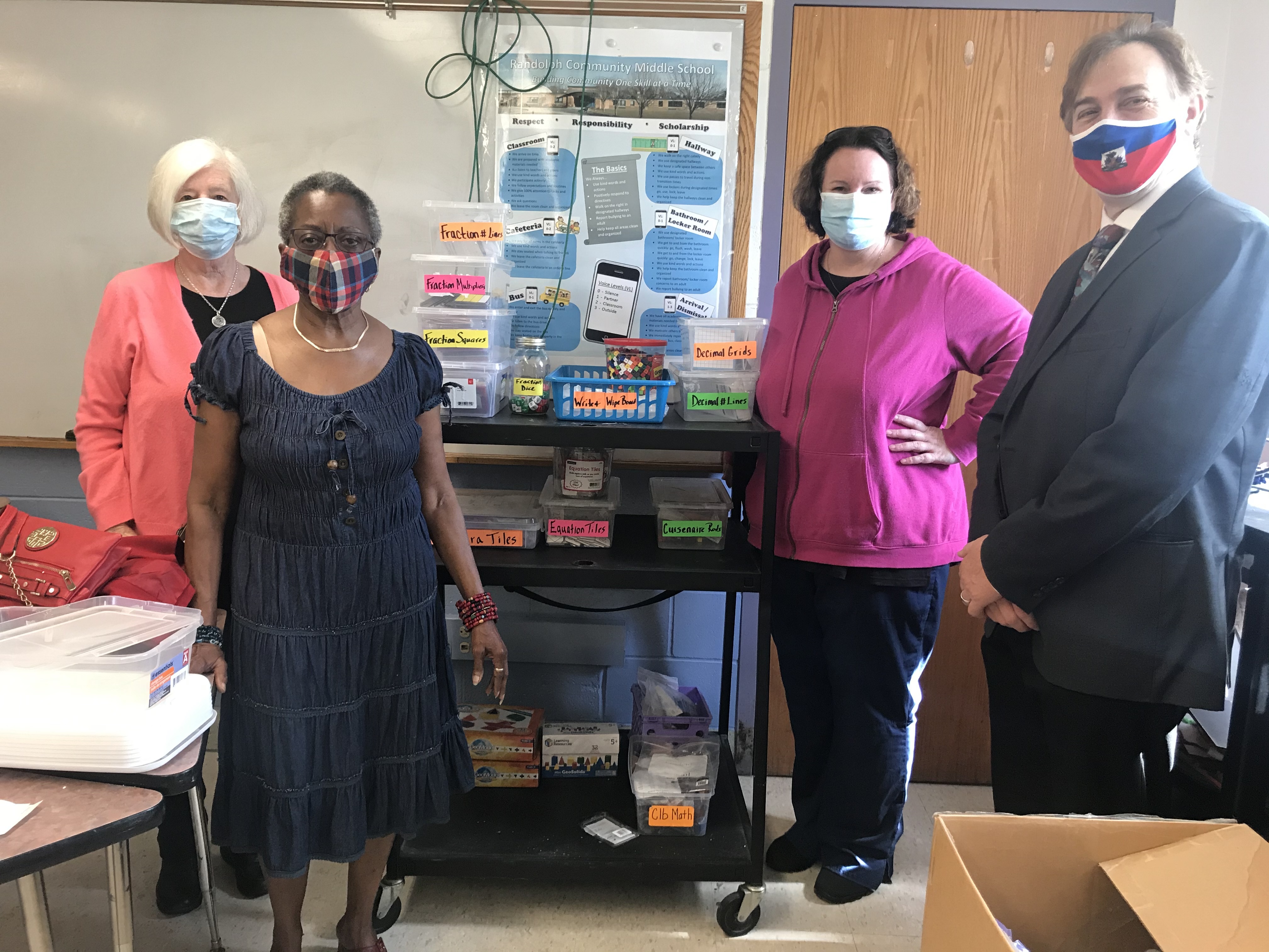 Young School grade 2 literacy Bee-Bots are a wonderful tool to teach students the fundamentals of computational thinking. The small robot can remember up to 40 commands consisting of forward, backwards, left and right movements to maneuver around the floor. ... The Bee-Bot allows students to create, explore, and problem solve to achieve success. This project was run by Young School teacher Susan Rudden-Horgan. Ms. Rudden-Horgan notes the newly purchased Beebot robots are a tool to teach the students the fundamentals of computational thinking as well as to create, explore, and problem-solve with 40 different comamnds. Students must learn mathematics with understanding, actively building new knowledge from experience and previous knowledge. We are planning to create a Math Manipulatives Library with material from all of 6th grade math domains. A Math Manipulatives Library will allow students to start at the concrete level and build to the abstract level. It will also give them the chance to actively build that knowledge from experience. A hands-on approach with manipulatives will deepen that understanding and allow them to be ready to expand on that knowledge and carry it to the next level with Learning. Pictured above are (left to right) RFE Director Judy Conway; RFE board member Mary Barrett, 6th grade teacher Alissa Kennedy, and RFE President Jesse Gordon. Not pictured is Sue Smith, the other 6th grade teacher involved in this project.